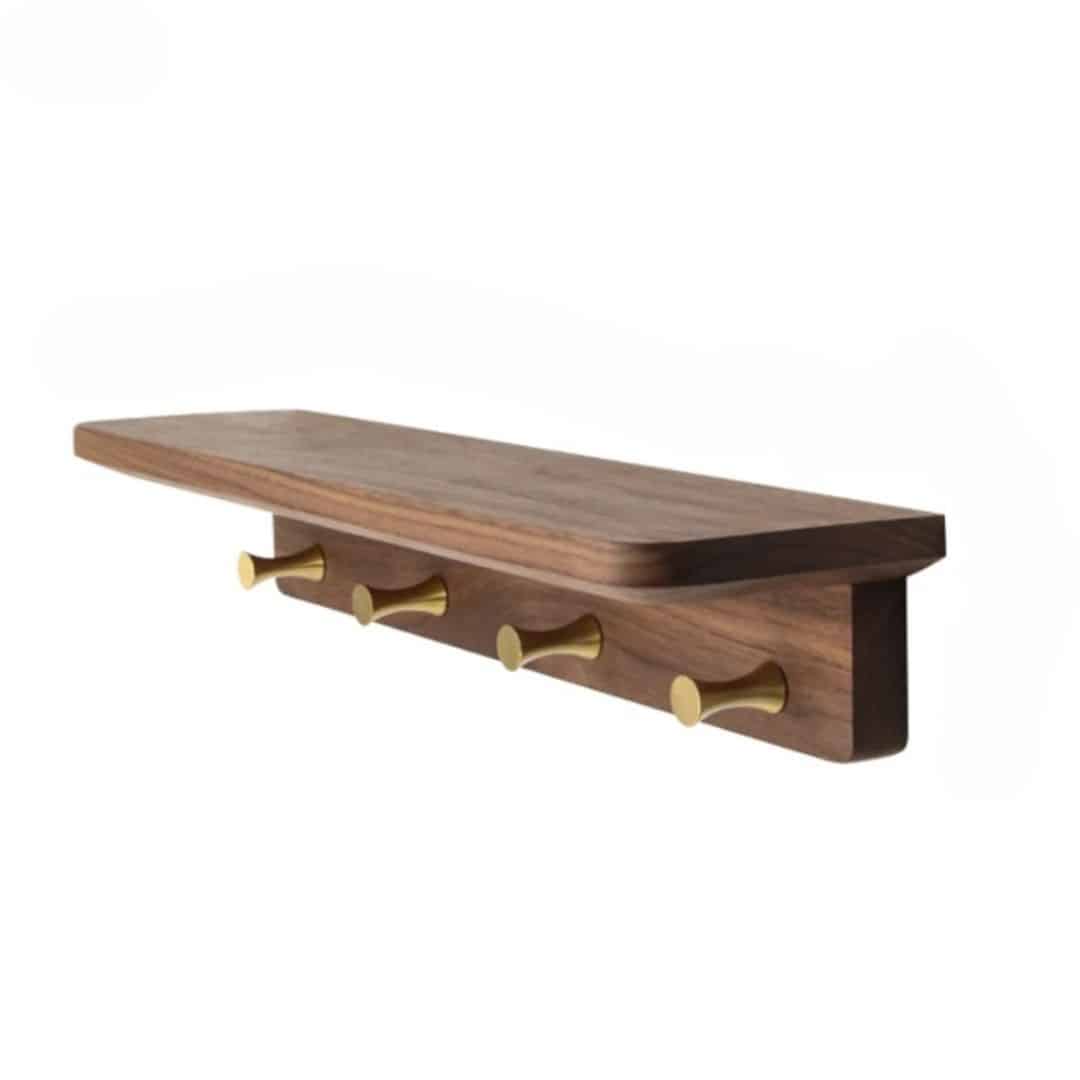 Cette étagère est fabriquée en bois de haute qualité, garantissant durabilité et solidité. La couleur marron du bois, enrichie par des crochets dorés, apporte une chaleur naturelle et une touche de luxe discret à votre déco bois. Ces crochets ne sont pas seulement pratiques pour accrocher vos clefs, mais ils ajoutent également un élément décoratif raffiné à l’étagère.
